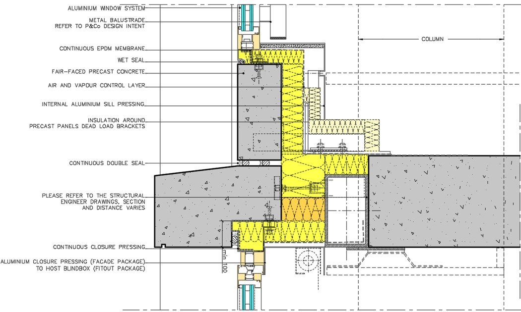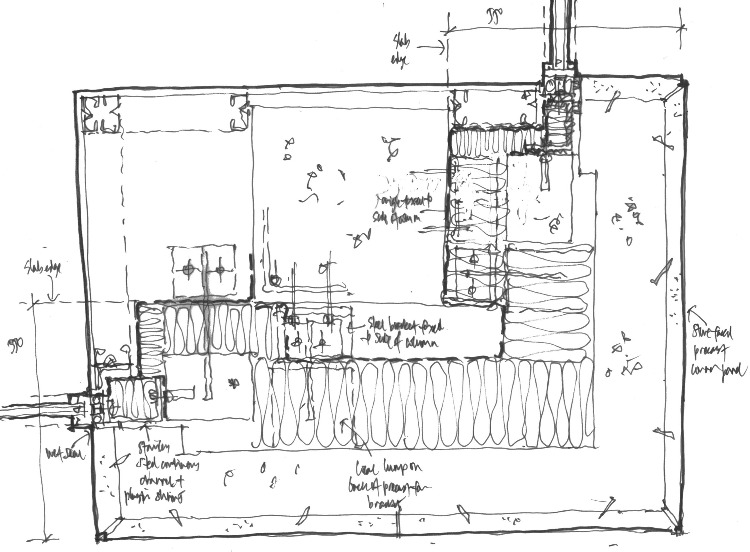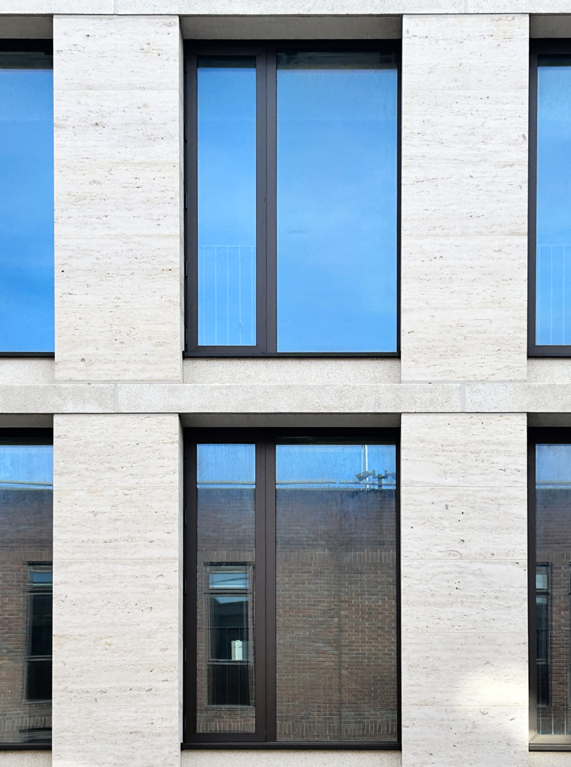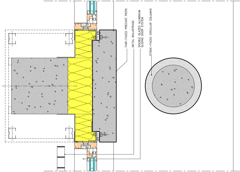 The South façade was one of the main technical challenges of the project, with solid circular Jura stone columns spanning vertically between a series of cantilevered, thermally broken, horizontal ledges at each floor. The circular stone columns sit in front of a series of glazed sliding doors making up the bulk of the façade and allowing for a physical connection with the river, as well as a stunning views over the water and the opposite bank beyond.