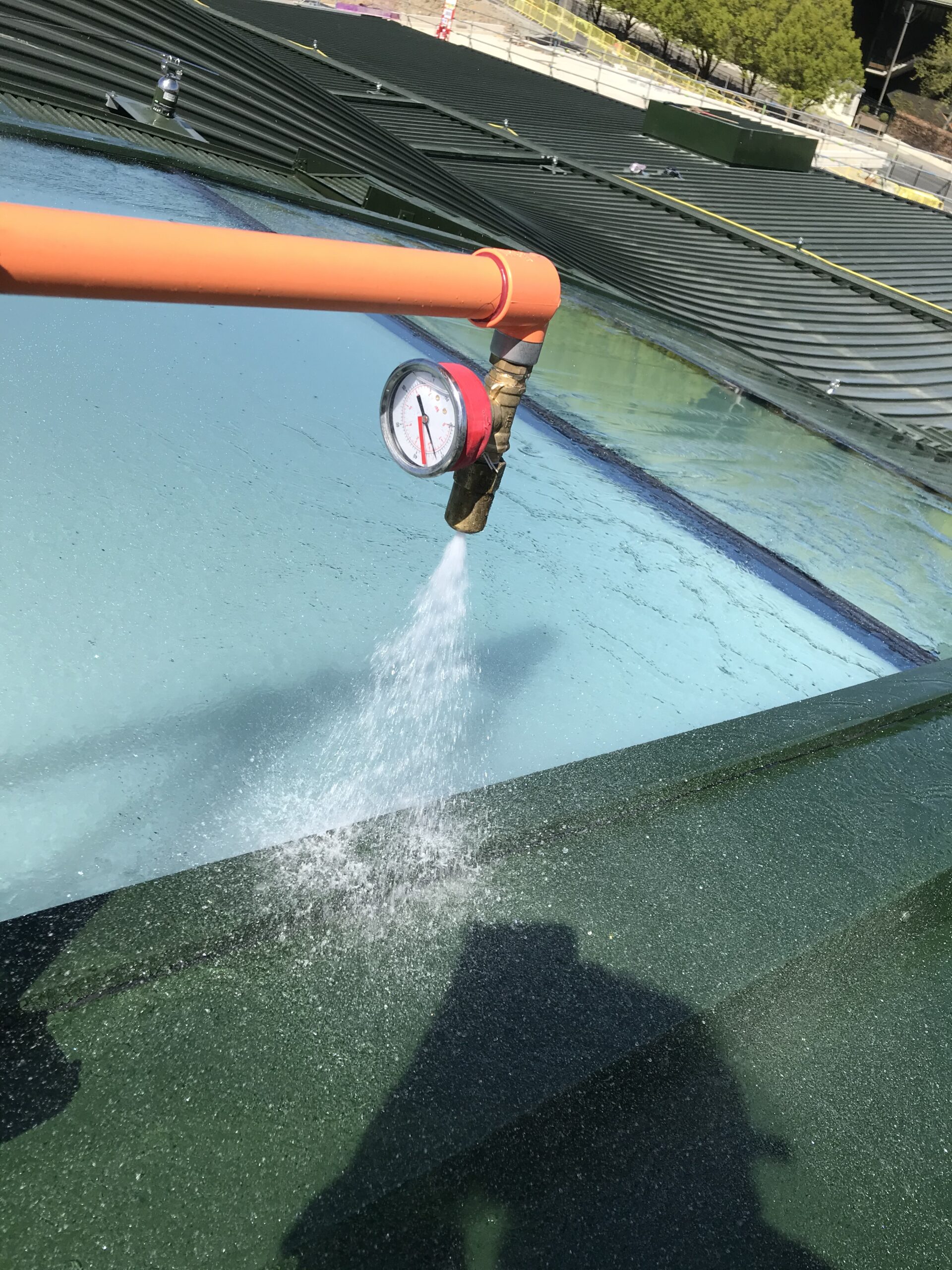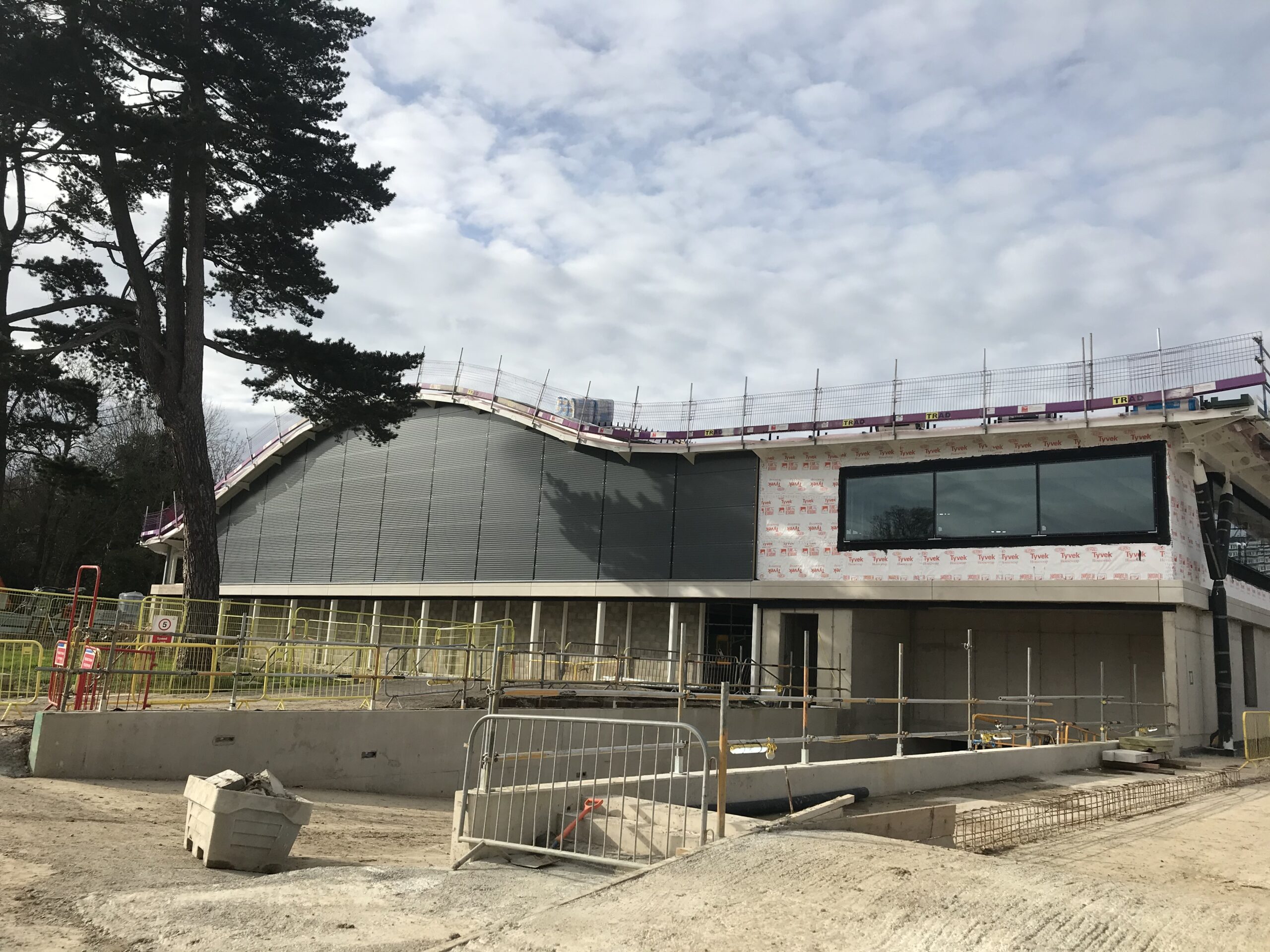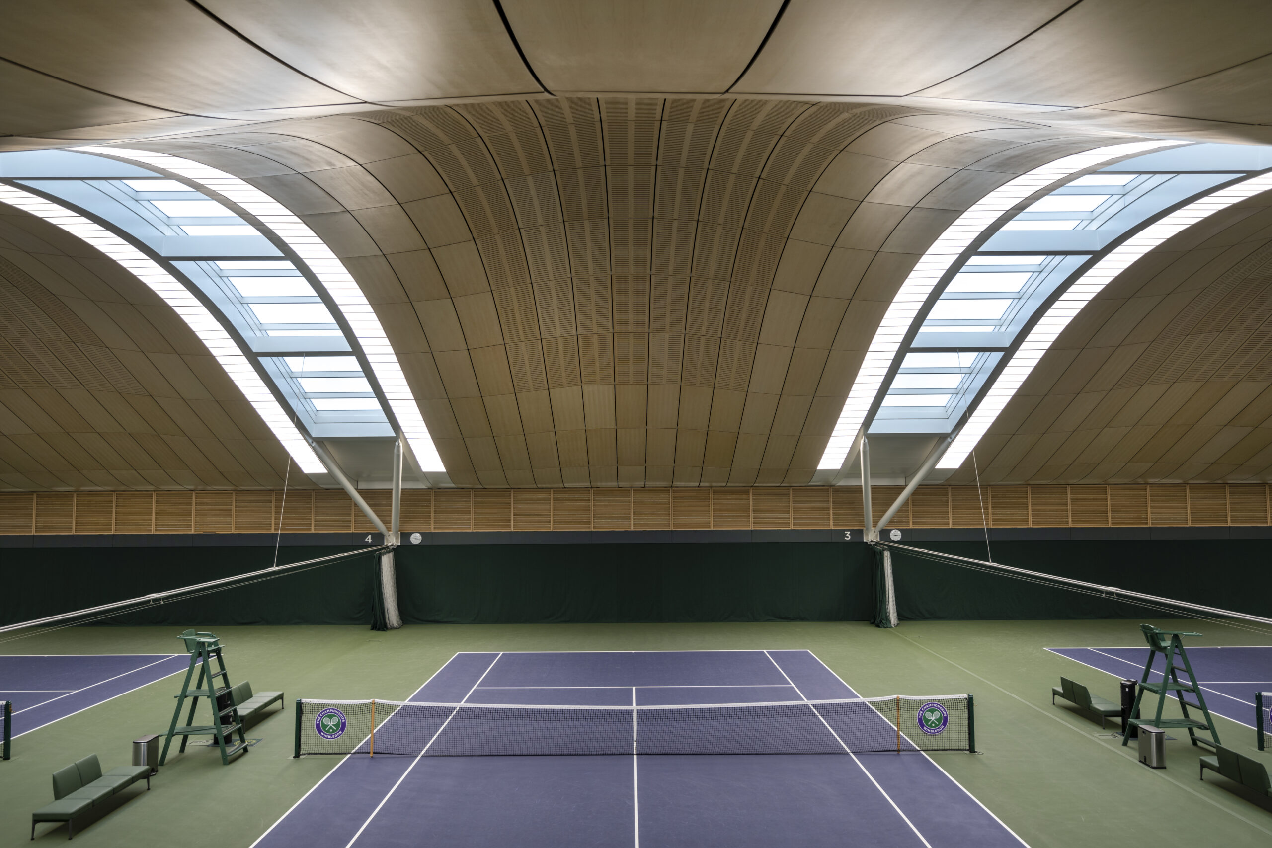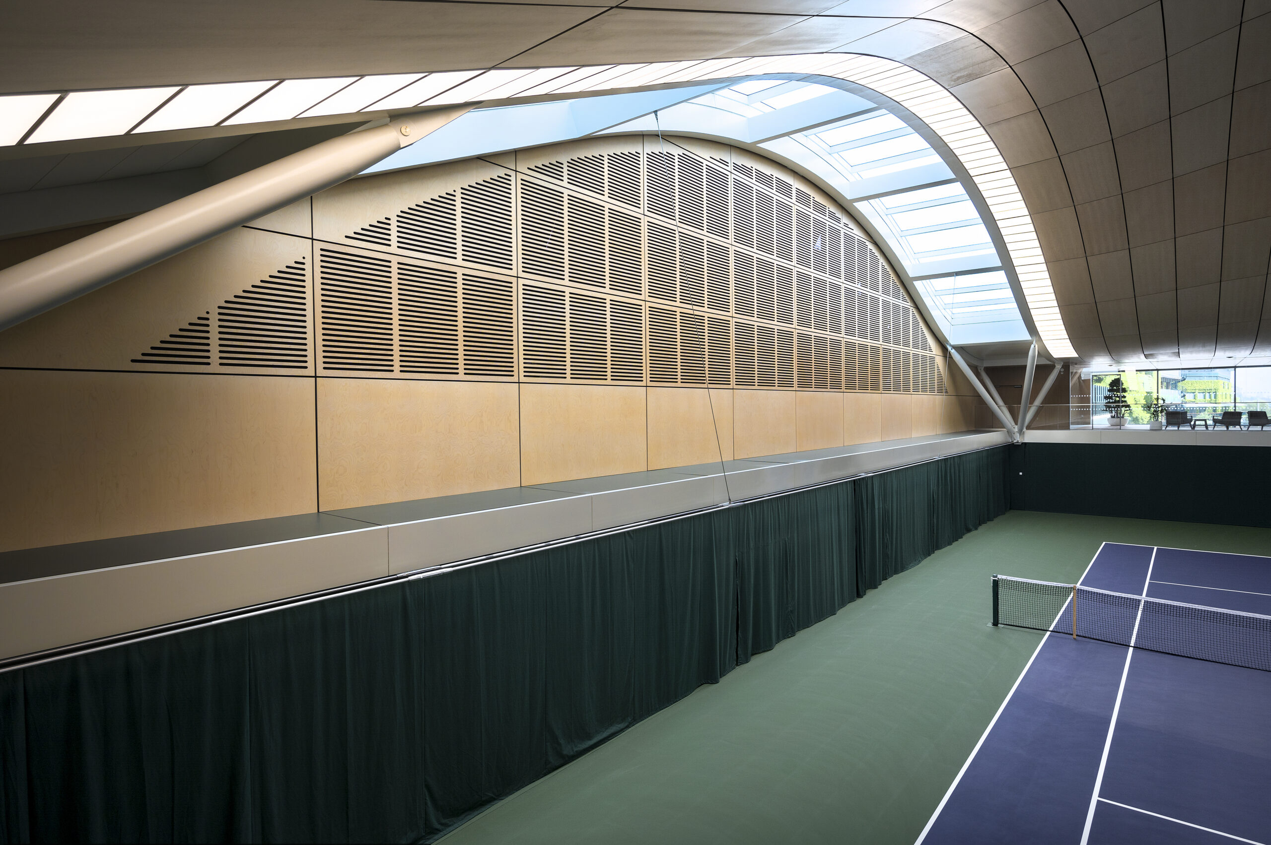 Our scope included involvement in the design of the double curved roof, using a standing seam roofing system in the club colours, glazed rooflights between the courts to provide daylight.