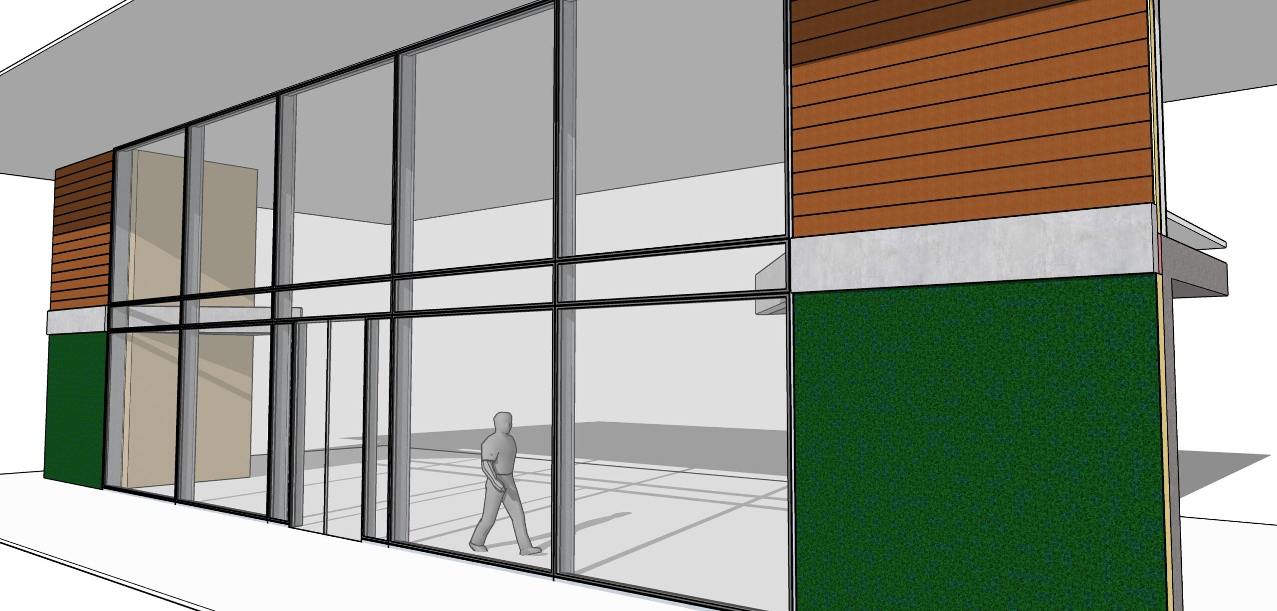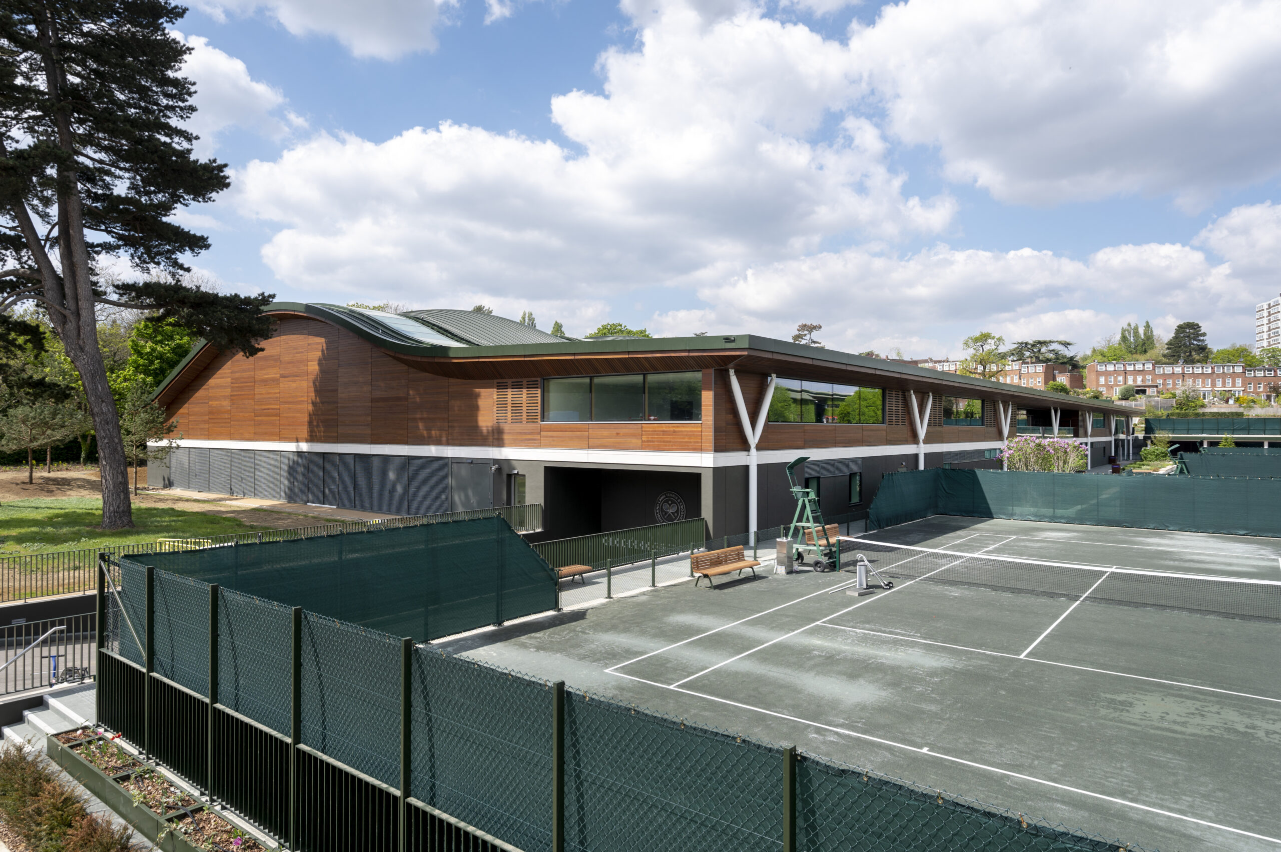 Timber cladding to both SFS and insulated metal panel substrates to the main body of the façade, with several integrated opening vents to provide natural ventilation through the tennis courts and precast concrete spandrel panels.